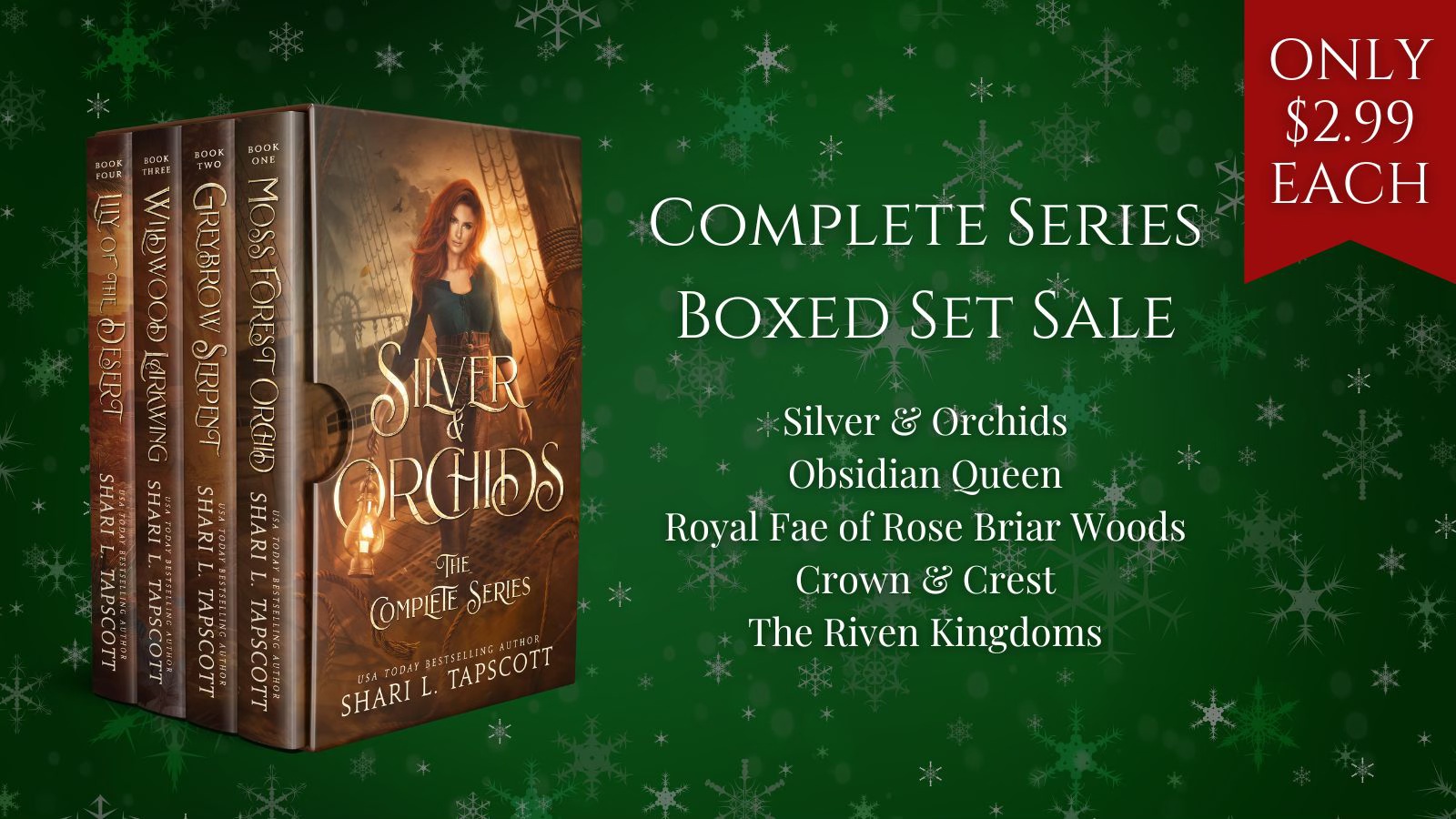 - All my complete series boxed sets are on sale this week. You can pick up The Riven Kingdoms, Obsidian Queen, Silver & Orchids, Royal Fae of Rose Briar Woods, and Crown & Crest for only $2.99 each.